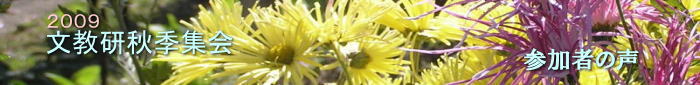 | 2009年文教研秋季集会が11月15日(日)午後、川崎市総合自治会館ホールで開かれました。テーマは太宰治「女生徒」を読む――〈希望を失いかけている人たち一人ひとりへ向けての励ましの文学〉として――。集会終了後参加者から寄せられた感想のいくつかを紹介します。 (2009.11.20) |
