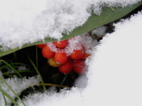 初雪の見事に降れり万年青の実