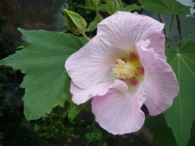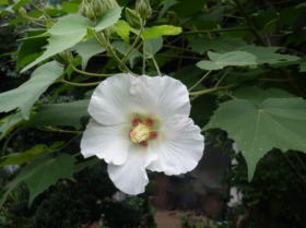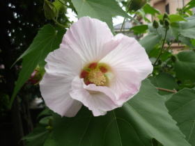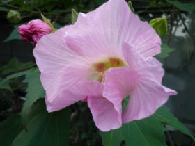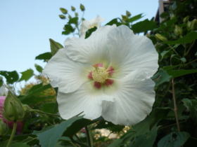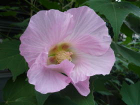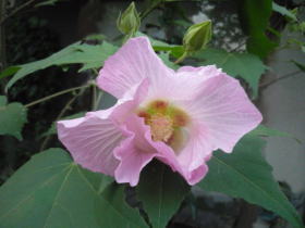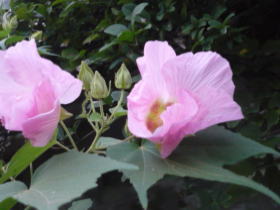 ●酔芙蓉は芙蓉の一種。 朝に咲いた純白の花が、 昼頃には微かな赤みを帯び、 夕方にはピンクに染まる。 (頁左上部のスライドショー参照 ▲で開始、■で中止) 白といふはじめの色や酔芙蓉 (鷹羽狩行) 補陀落(ふだらく)といふまぼろしに酔芙蓉 (角川春樹) 2009/09/28 酔芙蓉(すいふよう)(M.T.さん提供) rollover |